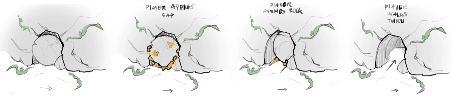 Doorway idea inspired by Indiana Jones. Sap again provides lubrication/magical reasoning for stone to move, this time a large stone sphere rolling backwards.