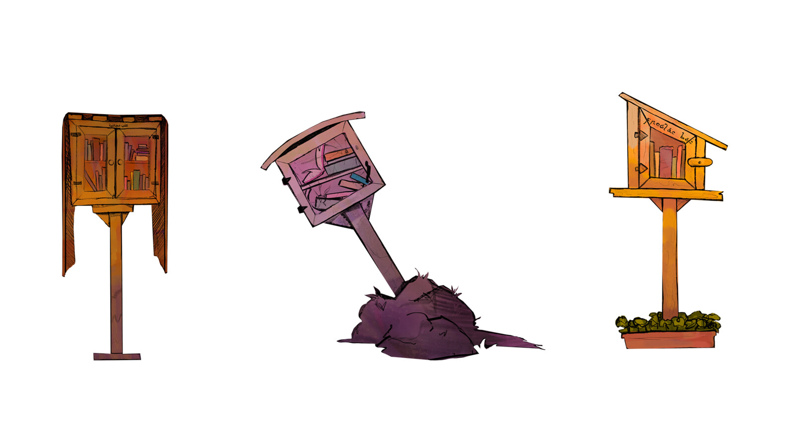 Backgrounds done for an Animated Illustration class. Included are the various Free Little Libraries located in each location. Very fun to design and paint!